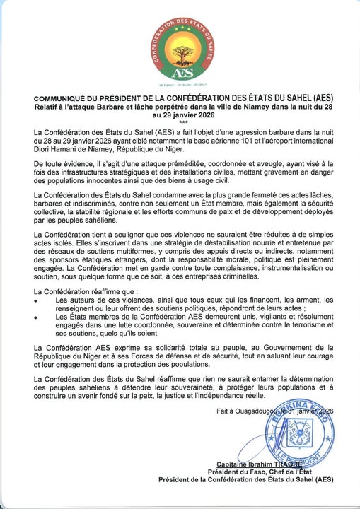 COMMUNIQUÉ DU PRÉSIDENT DE LA CONFÉDÉRATION DES ÉTATS DU SAHEL (AES) Relatif à l'attaque Barbare et lâche perpétrée dans la ville de Niamey dans la nuit du 28 au 29 janvier 2026.